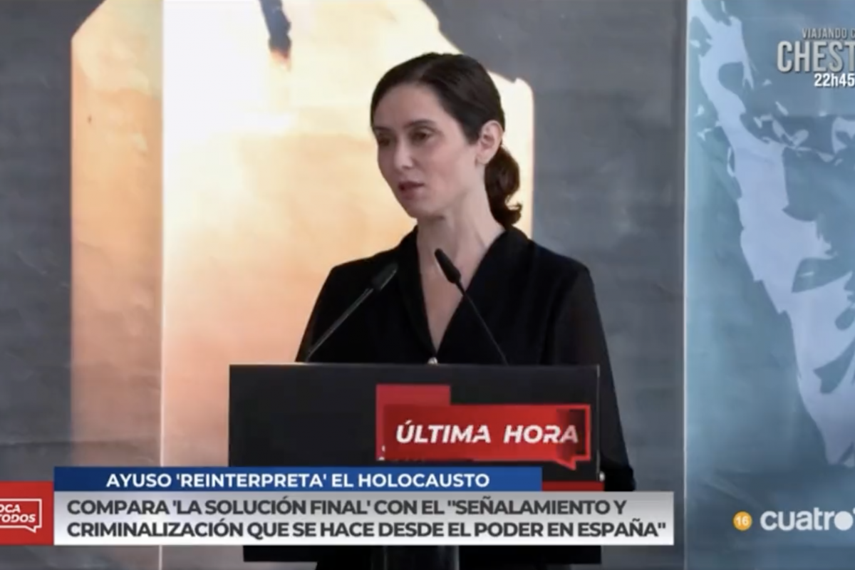 "Todo tiene un orígen. La Shoa no comenzó con la Solución Final. Empezó con el señalamiento, la criminalización, la deshumanización y la discriminación. Ejerciendo y fomentando desde el poder público y con los recursos del Estado. Como sigue pasando hoy por todo el mundo, también en España, en escuelas públicas, en entornos vecinales, en algunas calles, plazas", ha afirmado la presidenta de la Comunidad de Madrid.