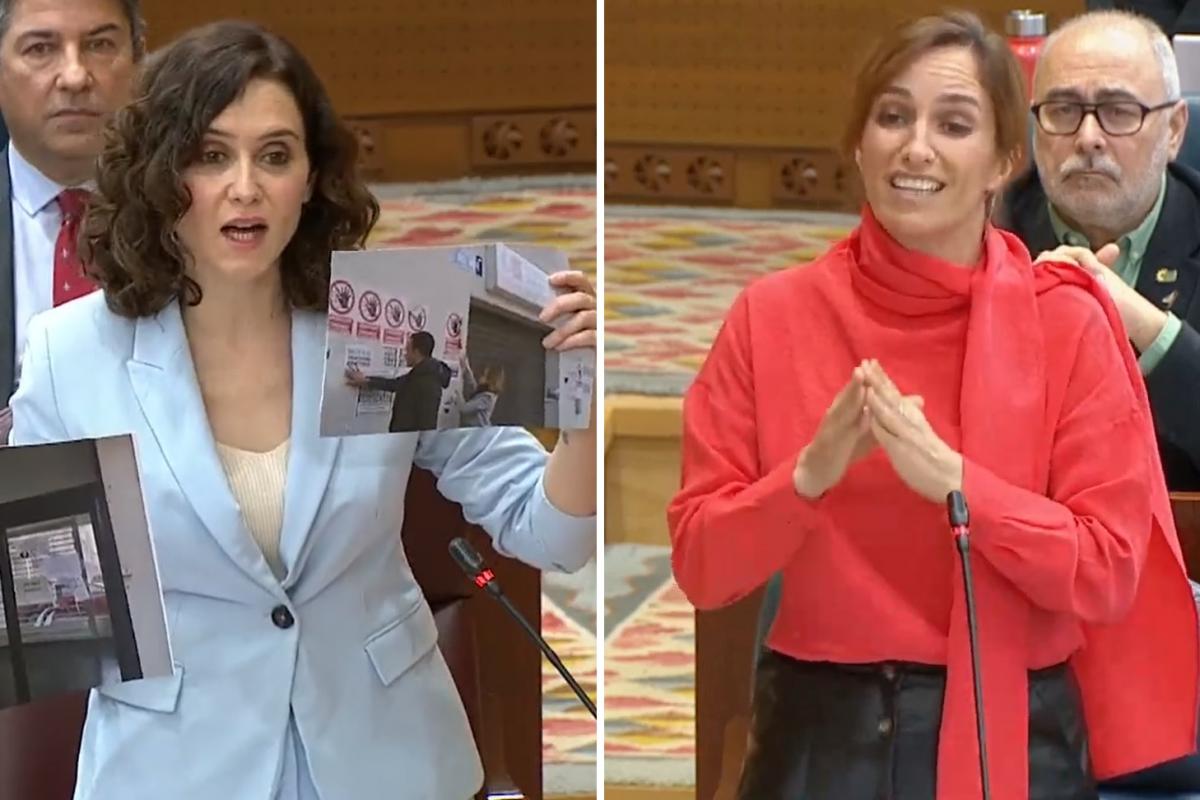 Ayuso saca dos fotografías en la Asamblea y Mónica García reacciona con un cartel con el que lo dice todo