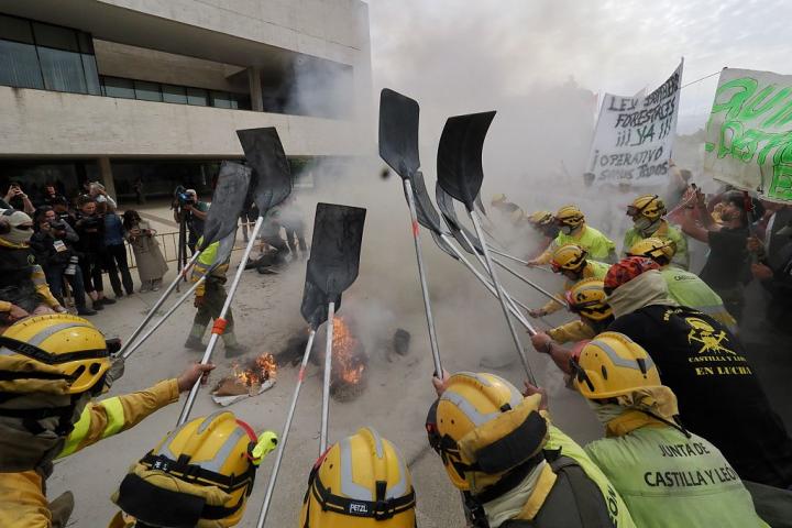 La concentración, que han protagonizado bomberos forestales y agentes medioambientales, que han bateado el suelo con sus palas y han quemado paja y neumáticos y han hecho rugir motosierras sin cadena para representar las situaciones que viven a diario, una hoguera en la que también han quemado carteles con la cara de Mañueco y de Quiñones.