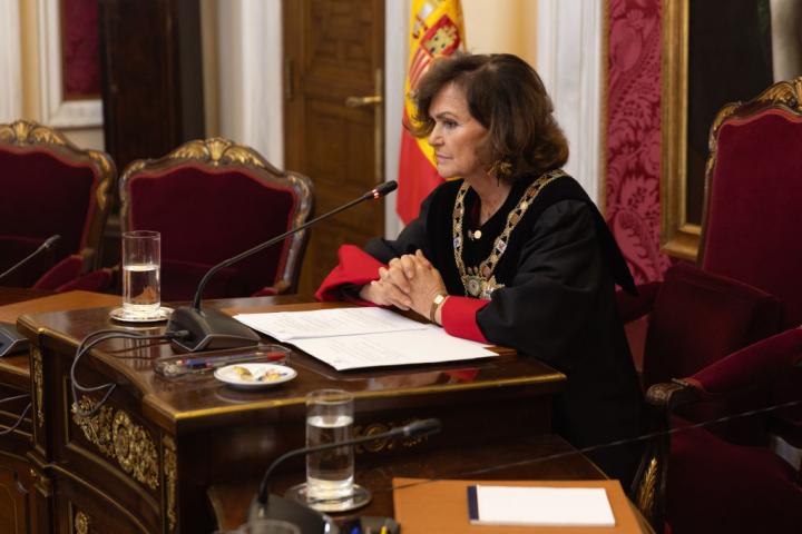 La exministra socialista y actual presidenta del Consejo de Estado, Carmen Calvo, ha asegurado que "no existe polémica" en el PSOE por las siglas LGTBIQ+, porque tanto en el último Congreso Federal como en el anterior, en 2021, "no sale LGTBIQ+, sale LGTBI". Pero es que además Calvo ha opinado que "Q+ responde a una teoría y a una ideología neoconservadora en la que no está el PSOE".