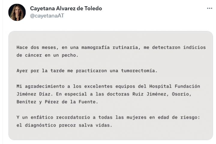 La diputada y exportavoz del Partido Popular, Cayetana Álvarez de Toledo, ha anunciado este sábado a través de su cuenta oficial de Twitter que padece un cáncer de mama del que ha sido operada recientemente.