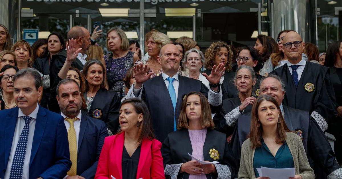 A Oliva Parrilla se les ha sumado en la lectura el resto de portavoces: María Jesús del Barco, presidenta de la Asociación Profesional de la Magistratura (APM); Sergio Oliva Parrilla, portavoz de la Asociación Judicial Francisco de Vitoria (AJFV); Fernando Portillo, presidente del Foro Judicial Independiente (FJI); Cristina Dexeus, presidenta de la Asociación de Fiscales (AF) y Miguel Pallares, presidente de la Asociación Profesional e Independiente de Fiscales (APIF).