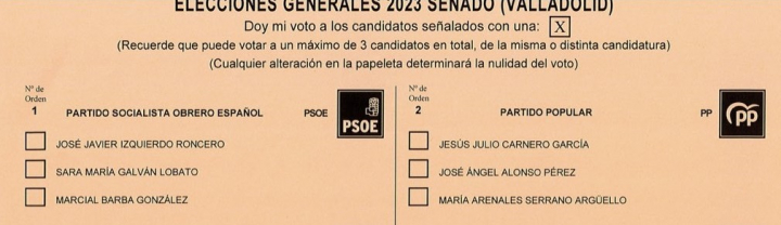 Habrá que marcar con una 'X' los senadores a los que se quiere dar el voto. El número máximo de cruces que se pueden poner en la papeleta son 3 en las circunscripciones provinciales, dos en las islas mayores y Ceuta y Melilla, y uno en las islas menores.