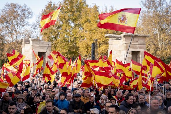 Durante la demora -el evento comenzó con 15 minutos de retraso-, el speaker y DJ del evento, una figura casi imprescindible en las liturgias políticas modernas, animaba y calentaba el ambiente con gritos y proclamas de todo tipo. Desde el ya famoso "Sánchez dimisión -o en su defecto, ¡a prisión!-", pasando por gritos de "Mafia" y "corruptos" en referencia al Gobierno, todos los manifestantes comenzaba a entrar en calor, alentado y bailando al son de la música y ondeando las miles y miles de banderas de España -y alguna del PP- que han sido las absolutas protagonistas de la concentración.