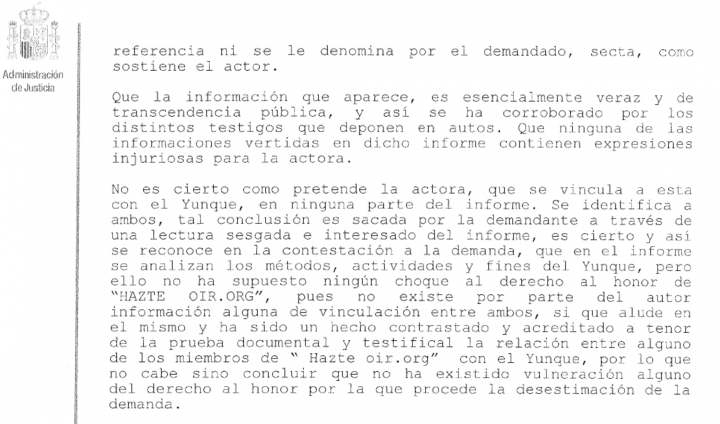 La jueza desestimaba de este modo una demanda por derecho al honor de Hazte Oír contra Fernando López Luengos por su extenso informe sobre El Yunque titulado El Transparente de la Catedral de Toledo.