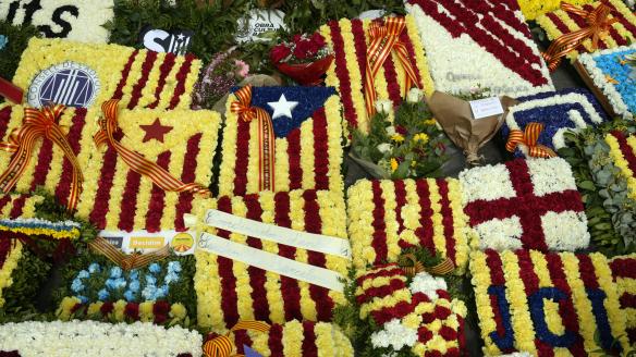 Así ha quedado el aspecto del monumento a Rafael Casanovas tras las ofrendas florales en Barcelona.