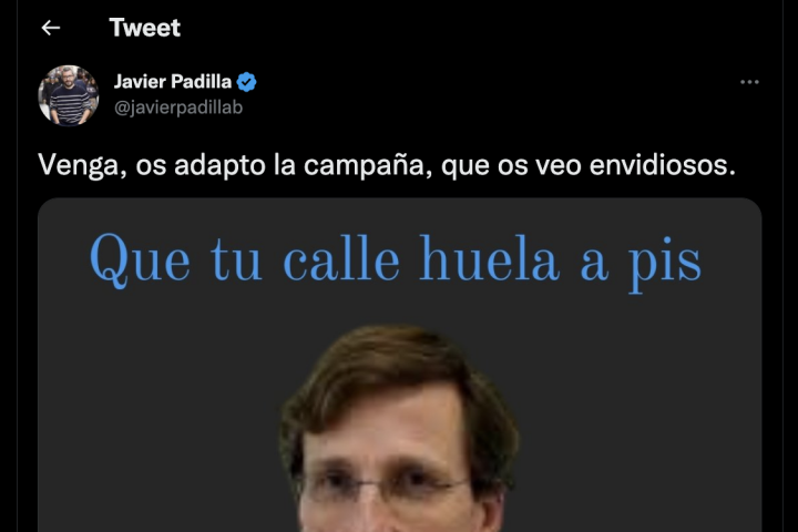 De ahí que Padilla haya contestado de una forma similar y haya acompañado la fotografía de Almeida con esta frase: "Que tu calle huela a pis, lo va a hacer José Luis". Del mismo modo, la publicación va acompañada, también, de este mensaje: "Venga, os adapto la campaña, que os veo envidiosos".