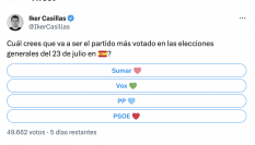 "¿Cuál crees que va a ser el partido más votado en las elecciones generales del 23 de julio?", preguntaba Casillas. La encuesta daba cuatro opciones: PP, PSOE, Vox y Sumar. Aunque la encuesta permanece activa hasta este sábado, más de 360.000 personas ya han votado. Y los resultados son sorprendentes: el PP sería el ganador de las elecciones con el 35,9% de los votos. Su margen de diferencia con Vox es muy estrecho, puesto que los de Abascal serían la segunda opción con el 31,9%. Por tanto, PP y Vox sumarían mayoría absoluta clara si estos resultados se extrapolaran a las elecciones generales de este domingo.