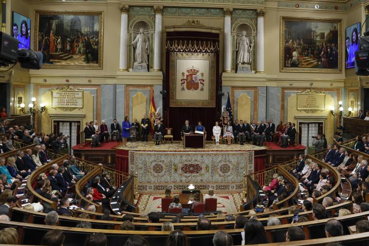 Los diputados, senadores e invitados a la Cámara Baja para el acto solemne de este miércoles han roto a aplaudir tras escuchar el himno de España mientras algunos parlamentarios gritaban "Viva la princesa" y "Viva el Rey" desde los escaños.