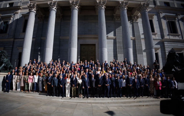 Feijóo, consciente en todo momento de su inevitable derrota, ha aprovechado las diferentes sesiones de su debate de investidura para exhibir unidad y despejar todas las dudas sobre su liderazgo en el PP. Si el miércoles se rodeaba de todos los presidentes autonómicos y algunos de sus alcaldes, hoy ha reunido a todos sus diputados y senadores en la escalinata de la puerta de los Leones para hacerse una foto que ha acabado con ovaciones y gritos en su apoyo.