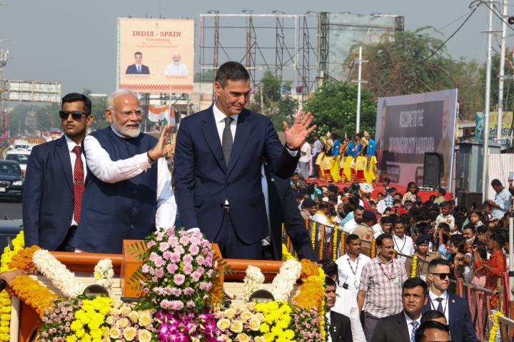 El presidente del Gobierno, Pedro Sánchez, y el primer ministro de India, Narendra Modi, ya comparten una intensa agenda durante el viaje oficial en India que ha empezado con un paseo en pickup. Encaramados en el hueco que deja el furgón, decorado con flores, Sánchez y Modi han recorrido varios kilómetros saludando a curiosos que esperaban el paso de la comitiva y donde se sucedían los carteles dando la bienvenida al presidente del Gobierno.