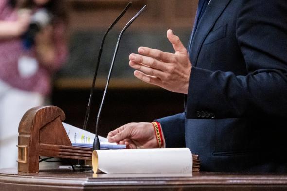 El presidente de Vox, Santiago Abascal, ha comparecido este miércoles desde la tribuna del Congreso de los Diputados durante el pleno sobre la guerra en Oriente Medio donde ha aparecido con un detalle que no ha pasado desapercibido. Se trata de una pulsera rojigualda que portaba en su muñeca derecha (cómo no) con una palabra que lleva tiempo formando parte de la estrategia de Vox: Reconquista.