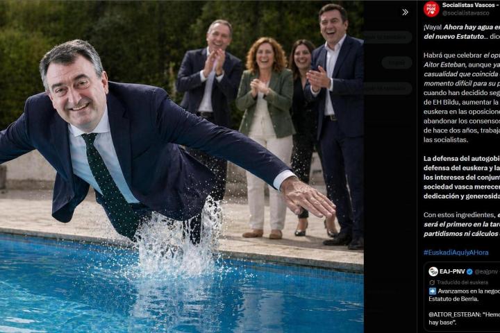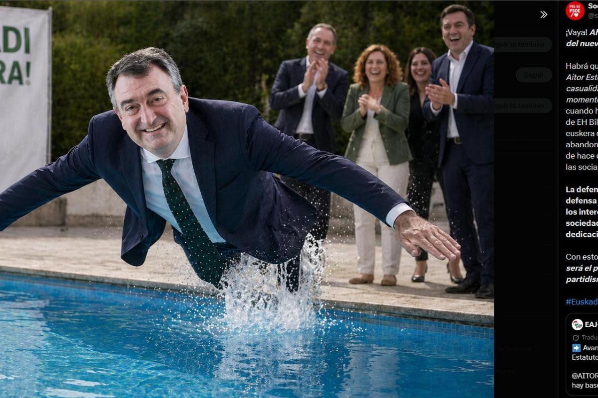 El texto del PSE no se ha quedado ahí. Además de acompañarlo de una imagen recreada con IA en la que se ve a Aitor Esteban tirándose a una piscina, han seguido: "La defensa del autogobierno, la defensa del euskera y la defensa de los intereses del conjunto de la sociedad vasca merecen rigor, dedicación y generosidad. Con estos ingredientes, el PSE-EE será el primero en la tarea, pero sin partidismos ni cálculos electorales".