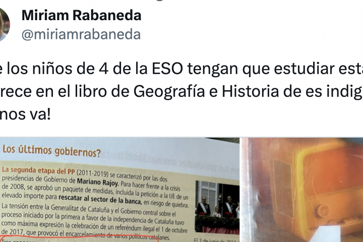 En su publicación, Rabaneda ha compartido la imagen del libro y ha recuadrado el párrafo que le ha provocado indignación, en el que se puede leer lo siguiente: "Tras conocerse varios casos de corrupción relacionados con su partido, Mariano Rajoy tuvo que abandonar la presidencia del Gobierno al ser reprobado en una moción de censura presentada por el dirigente socialista Pedro Sánchez".