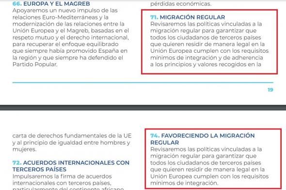 En el 74 copian la medida, aunque alargan el título y acortan la descripción. Con el título “Favoreciendo la Migración Regular”, ponen exactamente el mismo texto, aunque lo terminan antes, en “los requisitos mínimos de integración”.