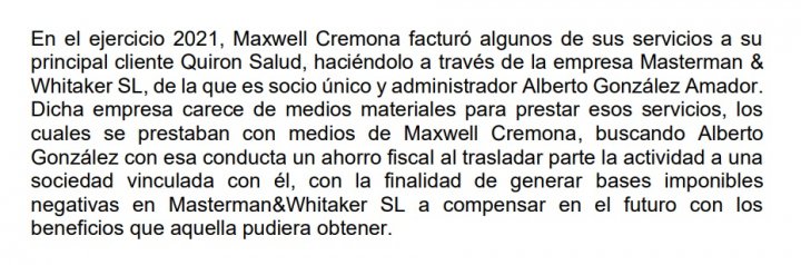 La Agencia Tributaria señala que durante el 2021 la empresa Maxwell Cremona facturó "algunos de sus servicios" a Quirón Salud y que lo hizo a través de la empresa Mastermann, la misma que la Agencia Tributaria señala como empresa pantalla con la que evitaba, siempre según Hacienda, pagar el impuesto de sociedades.