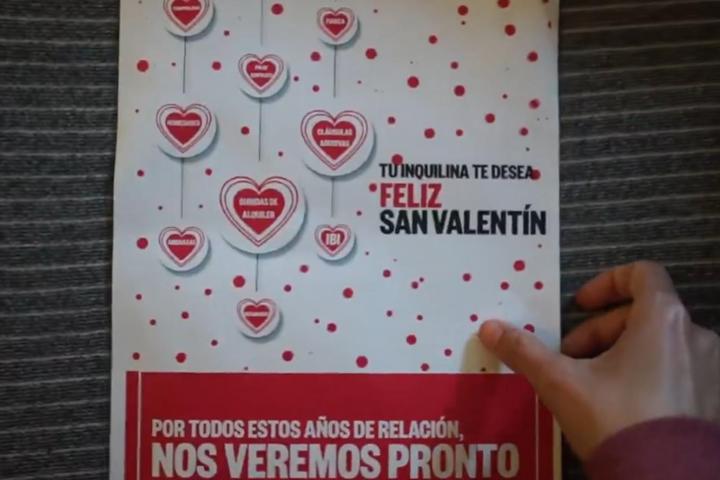 "Por todos estos años de relación, nos veremos pronto". Así termina la postal que el Sindicato de Inquilinas, el principal movimiento vecinal por la vivienda, ha enviado este viernes a los principales caseros y rentistas del país para felicitarles San Valentín y anunciar nuevas movilizaciones.