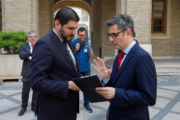 El vicepresidente de Aragón, Alejandro Nolasco (Vox), y el Ministro de la Presidencia, Justicia y Relaciones, Félix Bolaños, han mantenido un breve encuentro este jueves en Zaragoza durante la celebración de la Sectorial de la Administración de Justicia, que el también consejero de Justicia aragonés ha aprovechado para entregarle a Bolaños el informe del consejo consultivo que avala la legitimidad de la Comunidad para recurrir la recientemente aprobada ley de amnistía ante el Tribunal Constitucional.