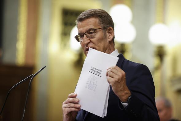 El presidente del Partido Popular, ganador de las elecciones del 23-J y candidato a la investidura como presidente del Gobierno, Alberto Núñez Feijóo, ha dado en el hemiciclo su discurso en la primera sesión del debate que se celebra desde este martes. Reiterando la hoja de ruta que propuso al actual mandatario español en funciones, Pedro Sánchez, y presentando -de nuevo- sus seis pactos de estado ante las Cortes, Feijóo protagoniza un intento de investidura a todas luces abocado al fracaso.