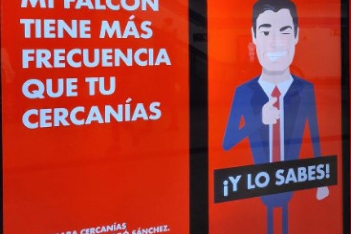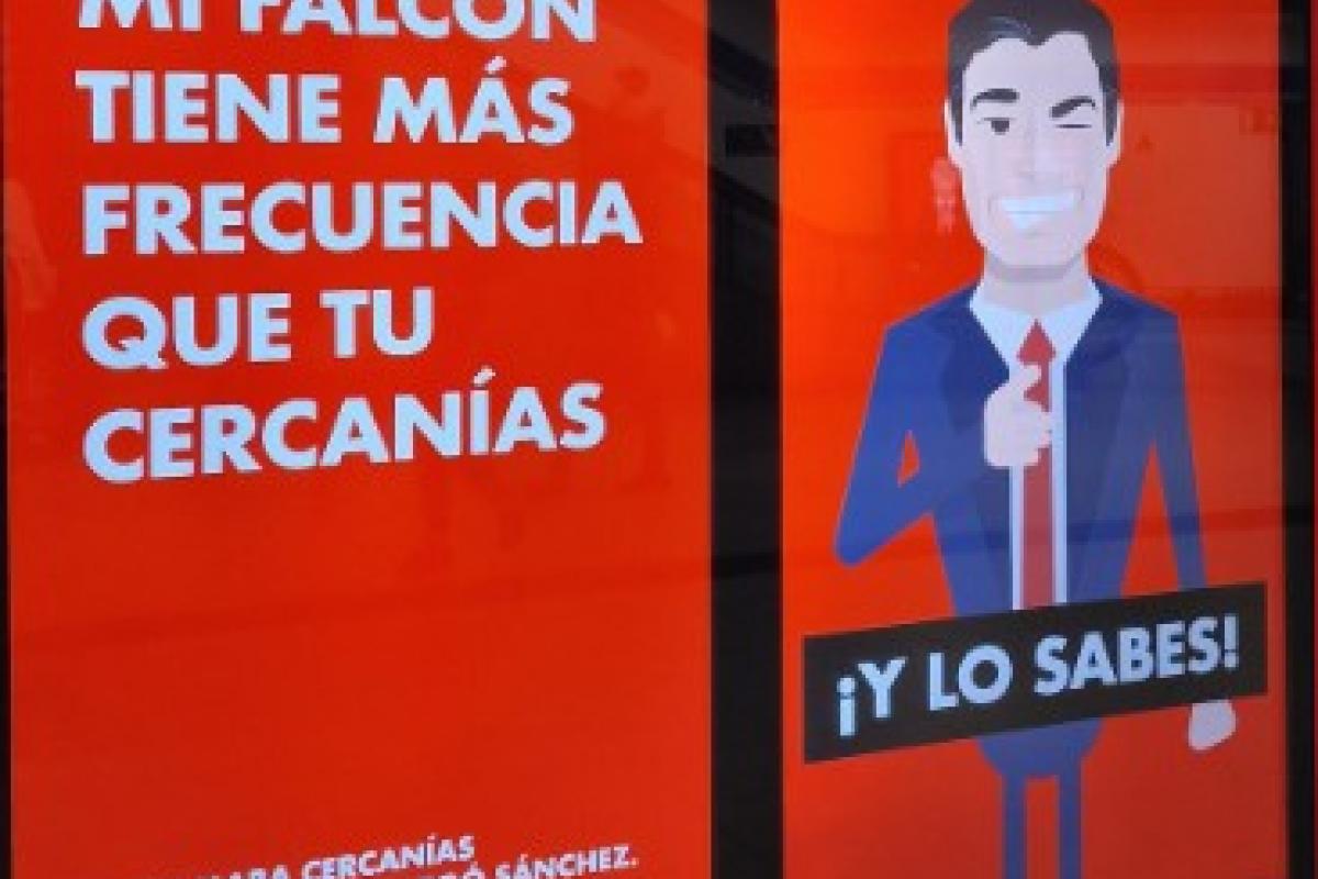 Este jueves, varios usuarios del metro de Madrid colgaron sorprendidos en sus redes sociales imágenes de una campaña contra Pedro Sánchez que el suburbano exhibe a través de carteles digitales situados en diferentes estaciones. En ellos, se pueden leer mensajes como "Se llamaba Cercanías hasta que se encargó Sánchez", "Yo en mi Falcon, tú en mi Cercanías" o "Mi Falcon tiene más frecuencia que tu Cercanías" junto a una imagen caricaturizada de Sánchez con gafas de sol, sonriente e incluso guiñando un ojo. El fondo usado es el rojo, color identificativo del PSOE, aunque en ningún momento se exhiben logos de otros partidos o se identifica al responsable de dicha campaña.