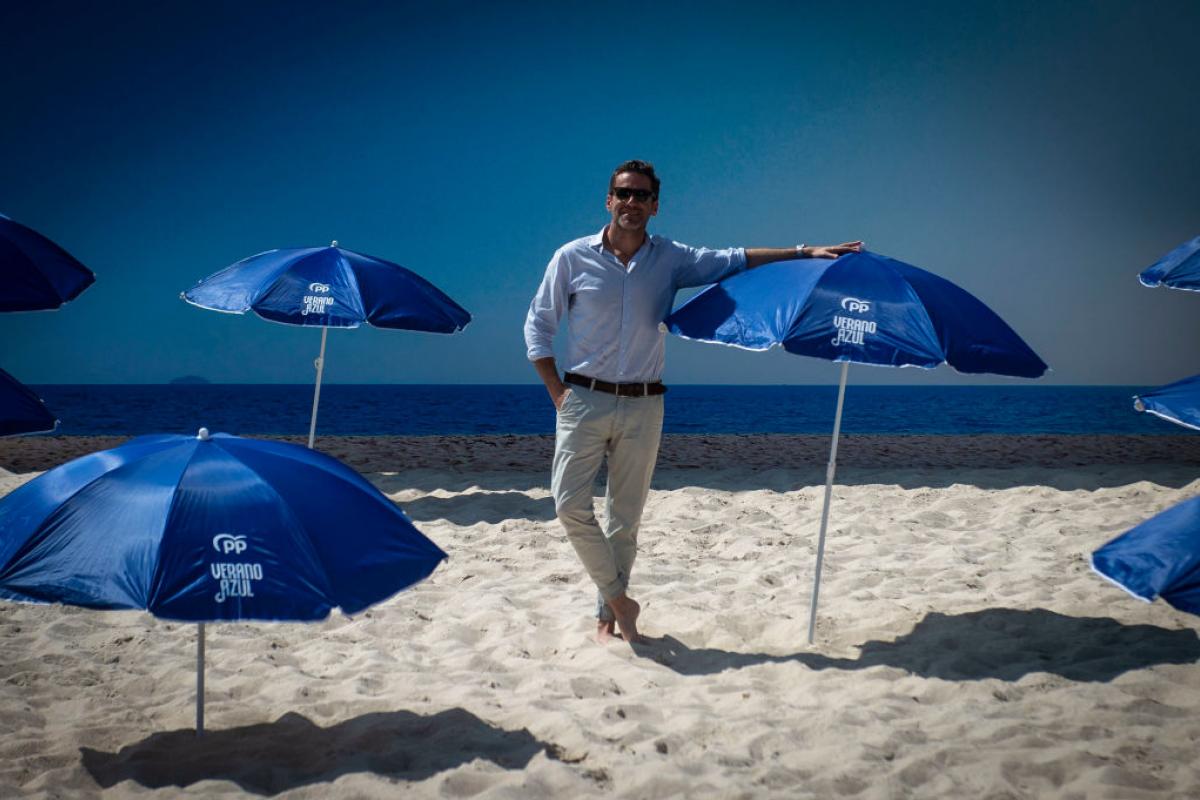 Borja Sémper, portavoz de campaña del PP, apareció este jueves rodeado por sombrillas azules en una 'playa' artificial de Madrid y con su lema de precampaña para las próximas elecciones generales, "Verano Azul".