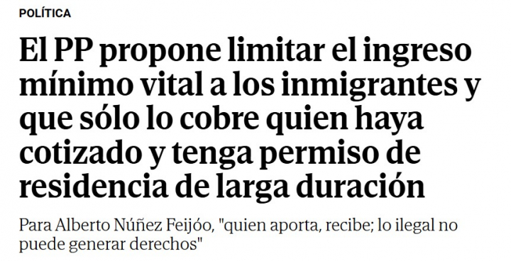 En su discurso de este domingo en Murcia, ante sus barónes autonómicos, Feijóo afeó que "cualquier inmigrante irregular se empadrone y pueda pedir el ingreso mínimo vital". Una idea que el diario El Mundo, citando fuentes populares, ya adelantó el pasado sábado. En dicha información, se señalaba que Génova estudiaba "prohibir el acceso al Ingreso Mínimo Vital (IMV) a los inmigrantes que no hayan cotizado en España y que no tengan permiso legal de residencia de larga duración".