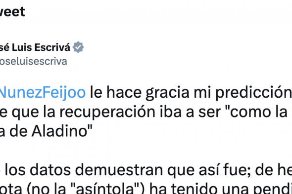 "A @NunezFeijoo le hace gracia mi predicción de 2020 de que la recuperación iba a ser "como la lámpara de Aladino" 📈Pero los datos demuestran que así fue; de hecho, la asíntota (no la "asíntola") ha tenido una pendiente mayor que la que esperábamos: el empleo ha ido aún mejor", ha señalado el ministro en la red social del pájaro azul.