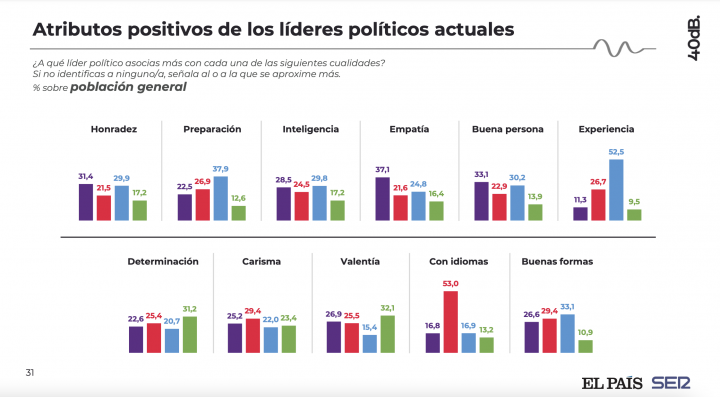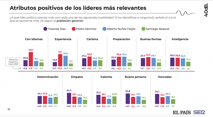 Apenas seis meses después, en noviembre, su mejor atributo, la experiencia, perdía claramente respecto a su rival más directo, Pedro Sánchez, pasando del 52,5% al 35,6%. Casi 17 puntos menos frente a un presidente del Gobierno que crecía en ese aspecto 14 puntos, saltando del 26,7% de mayo al 41,1%.