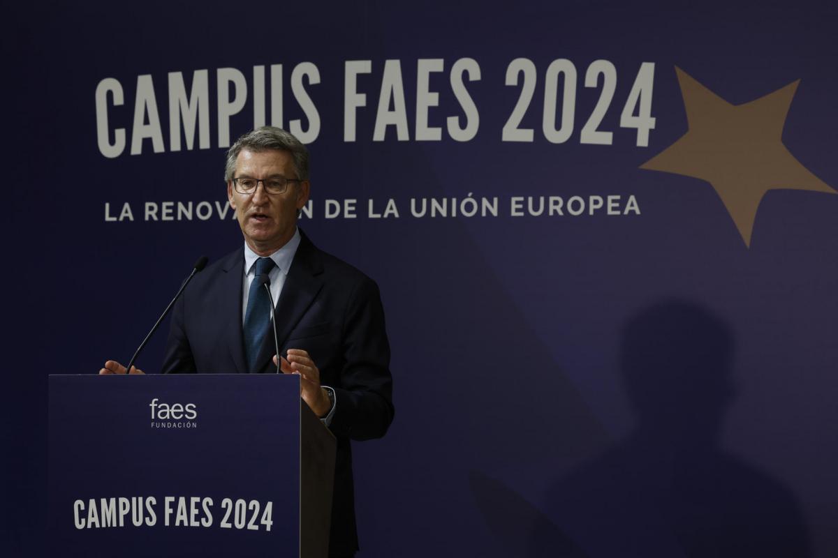 En su intervención junto al expresidente José María Aznar en el marco de la clausura del campus de la Fundación FAES, Feijóo, aunque ha compartido la posición del Gobierno en la disputa con México, ha aprovechado para atacar la política exterior de Sánchez.