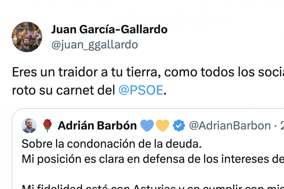 El vicepresidente de Castilla y León, Juan García-Gallardo, del partido de extrema derecha Vox, ha vuelto a demostrar que tiene la mano muy larga en X (antes Twitter), donde ha cargado duramente contra el presidente de Asturias, el socialista Adrián Barbón, por los acuerdos del PSOE con ERC y la condonación de parte de la deuda catalana que han pactado ambas formaciones.