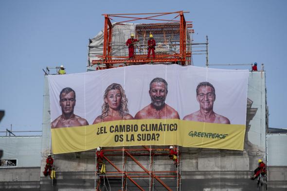 Greenpeace despliega una lona con candidatos "sudando" por el cambio climático y Yolanda Díaz responde