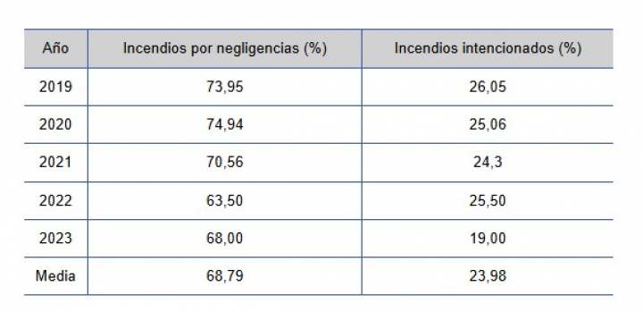 Bajo esta premisa, la Fiscalía General establece que en 2023 el 68% de los incendios fueron causados por negligencias y el 19% fueron intencionados. Unas cifras muy similares a la media de los últimos cinco años: el 68,79% fueron por un actitud negligente y un 23,98% por una acción deliberada y consciente. Por tanto, sólo uno de cada cuatro incendios en España habrían sido intencionados.