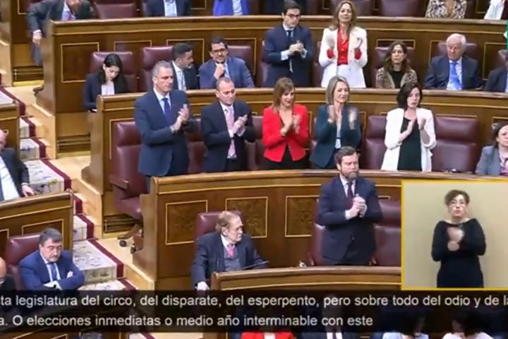 En varios momentos en los Abascal paraba en su discurso, el resto de los diputados de la formación ultraderechista le aplaudían desde sus escaños. Pero una persona sentada en las bancadas de Vox no lo ha hecho y este ha sido Ramón Tamames.