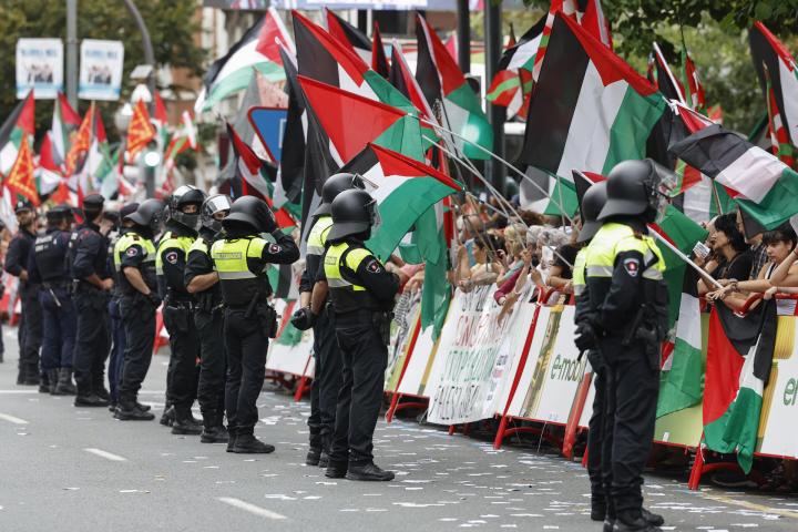 La carrera había salido a las 13.35 horas desde la explanada de San Mamés en Bilbao y cuando el pelotón circulaba, de manera neutralizada, por el Alto de Enekuri, minutos antes de las dos menos cuarto de la tarde, un grupo pequeño de personas se colocó en la carretera con una pancarta en la que se podía leer 'Destroy Israel' ('Destruye Israel') y con banderas de Palestina.
