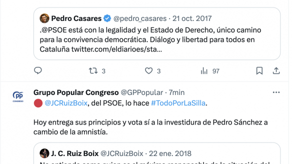 Respecto a las críticas de las derechas sobre los acuerdos alcanzados por el PSOE con formaciones nacionalistas, Esteban ha señalado que "llama la atención que los acuerdos con los partidos nacionalistas siempre se consideren ilegales. Como si los votantes de los mismos no tuvieran derecho a nada" y ha aprovechado para recordar los constantes intentos del PP por llegar a un acuerdo para que el PNV apoyase la investidura de Feijóo, cuestión que rechazaron en repetidas ocasiones apuntando a la incompatibilidad con el apoyo de Vox: "Algún día igual contaré lo que nos llegaron a ofrecer hace un par de meses", ha deslizado el portavoz jeltzale.