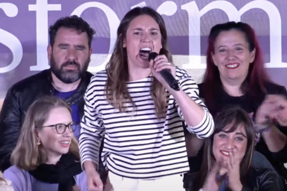 La ministra de Igualdad tilda de "especuladora inmobiliaria" a la periodista durante el mitin de cierre de campaña de Podemos en Madrid.