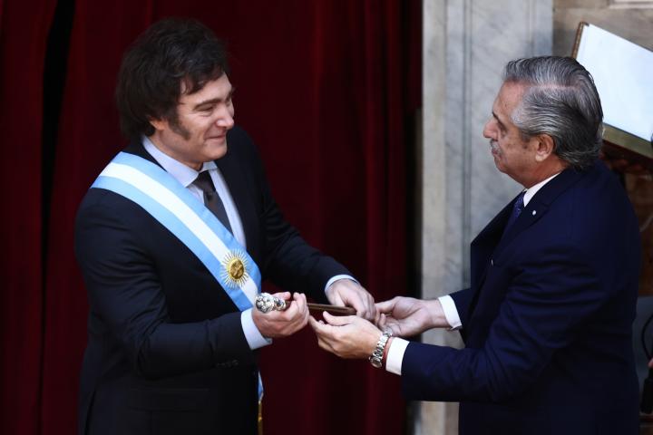 El líder de La Libertad Avanza recoge el bastón de mando y toma el relevo a Alberto Fernández al frente del país. Victoria Villaruel hace lo propio con Cristina Fernández de Kichner y es, desde hoy, vicepresidenta de Argentina.