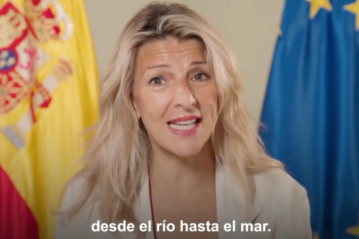 En un vídeo publicado también en sus redes sociales, la vicepresidenta Díaz celebró el reconocimiento del Estado palestino. "Es, sobre todo y por encima de todo, un acto de humanidad", comentó la también coordinadora general de Sumar. En el vídeo, Díaz recordó que "35.000 personas han sido asesinadas por el Estado de Israel en los últimos meses, un tercio siendo niños y niñas". Las palabras a las que hace referencia la embajadora israelí aparecen al final del vídeo: "Palestina será libre desde el río hasta el mar", concluyó la vicepresidenta del Gobierno.