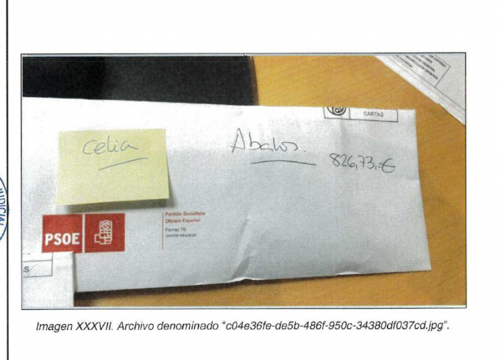 Uno de los ejemplos que señala la UCO es un sobre dirigido a Ábalos recogido por Koldo García en junio de 2019, que según lo comunicado por el PSOE debería contener 321,29 euros en efectivo, procedentes de la caja, y que según la cifra manuscrita en la imagen del sobre con membrete del PSOE contendría en cambio 826,73 euros, por lo que la diferencia ascendería de 505,44 euros.