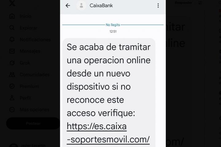 En concreto, el SMS que reciben los clientes de Caixabank alerta de que se ha llevado a cabo "una operación online desde un nuevo dispositivo". E invita a que si no has sido tú, verifiques tus datos a través de un enlace que lleva a una web falsa que imita a la oficial del banco, pero que en realidad está controlada por los estafadores.