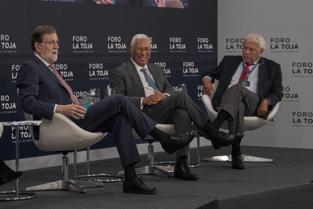 Sobre Mario Draghi: “Era el presidente de la BCE cuando Portugal y España lo pasábamos bárbaro con nuestras primas de riesgo y algunas otras cosas. [...] Ahora va a dar 800 u 850.000 millones al año, que ya nos explicará alguien de dónde van a salir, pero claro, a nosotros nos dio 0. A mí me dio 0, con la prima de riesgo a 200 y pico”. “0 patatero”, interrumpió Felipe González. “0 patatero”, confirmó Rajoy.
