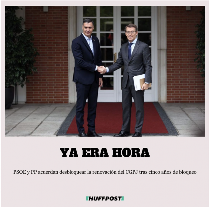 Pedro Sánchez y Alberto Núñez Feijóo acordaron la renovación del Consejo General de Poder Judicial (CGPJ) tras cinco años de parálisis. Ambos líderes consideraron insostenible el bloqueo judicial y, tras una reunión de más de cinco horas en Moncloa, anunciaron el pacto para renovar a los vocales del órgano del gobierno de los jueces. Tanto PSOE y PP garantizaron también la independencia de la Justicia y anunciaron medidas para evitar en un futuro nuevas situaciones de bloqueo.
