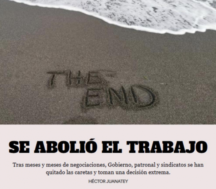 Ni 38, ni 37, ni siquiera 30 horas. Tras varios meses de unas negociaciones que no parecían llegar a buen puerto, Gobierno, patronal y sindicatos se han puesto por fin de acuerdo. Para evitar volver a verse las caras, han acordado abolir al 100% el trabajo. De esta forma, desde este momento ya nadie está obligado a seguir en su puesto de tr (sic).