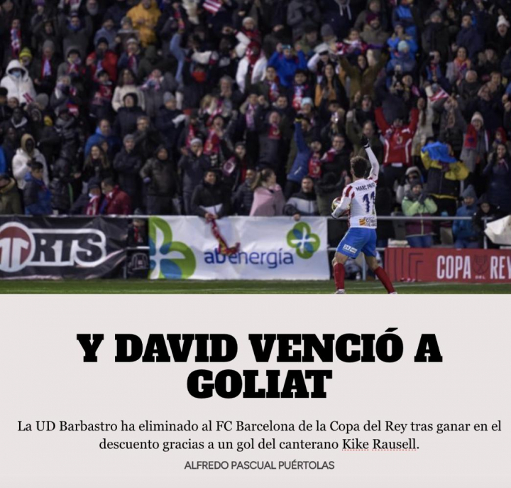 Delirio colectivo en Barbastro y nueva demostración de que los imposibles, a veces, se hacen realidad. Contra todo pronóstico, la UD Barbastro, de 2ºRFEF, ha logrado eliminar en 16avos de la Copa del Rey al FC Barcelona en un día histórico para un club que está viviendo su época más dorada. El equipo de Xavi Hernández llegaba a la cita repleto de dudas y, desde el primer momento, el club altoaragonés consiguió neutralizar a futbolistas como Lewandowski o Lamine Yamal hasta el punto de ser el gran dominador en el tramo final del partido. En el minuto 94 y como si fuera un capricho del destino, Kike Rausell, canterano, barbastrense y capitán del equipo, logró tras rematar de cabeza un córner el gol que daba la clasificación al Barbastro y provocó la locura entre los 5.000 aficionados que vivieron en las gradas el partido de sus vidas.