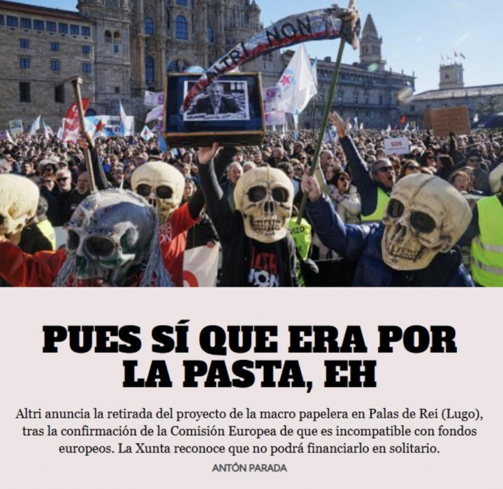 Greenfiber, la filial de la multinacional lusa Altri que busca instalar una macro papelera en la localidad lucense de Palas de Rei, ha anunciado en un comunicado urgente que el proyecto ha sido retirado finalmente. A pesar de las múltiples críticas y de la lucha medioambiental que ha unido a distintos sectores de sociedad, desde vecinos, agricultores y ganaderos a la práctica totalidad del sector pesquero gallego, dicha retirada se produce en la misma jornada en la que la Comisión Europea ha confirmado que el proyecto es incompatible con el acceso a fondos europeos tras el análisis exhaustivo de los niveles de consumo de agua y el proceso de tratado que defendía la compañía como innovador.