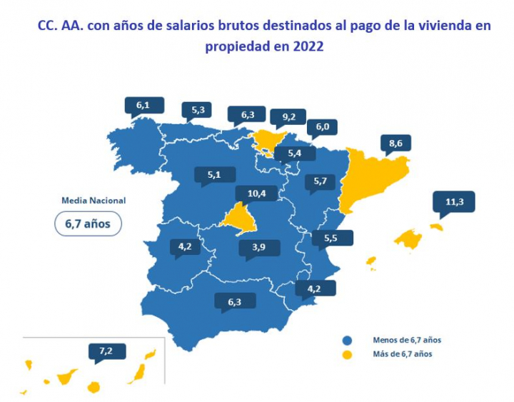 Según indica el estudio, en 2022 sólo en tres comunidades (Cantabria, Castilla y León y Castilla-La Mancha) bajaron los años que el español medio dedica al pago de la vivienda, creciendo en trece.