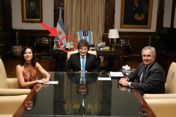 Si hacemos zoom y observamos con detalle la misma mesa, vemos que también hay un pequeño busto con su imagen y un termo con otra fotografía del mandatario junto a uno de sus perros. Pero lo más sorprendente es que a la izquierda hay una taza blanca que pasaría completamente inadvertida si no fuera porque se puede leer grabado en ella: "Lágrimas de zurdo". Cabe recordar que "zurdo" es como Milei llama despectivamente a las personas con ideología de izquierdas.