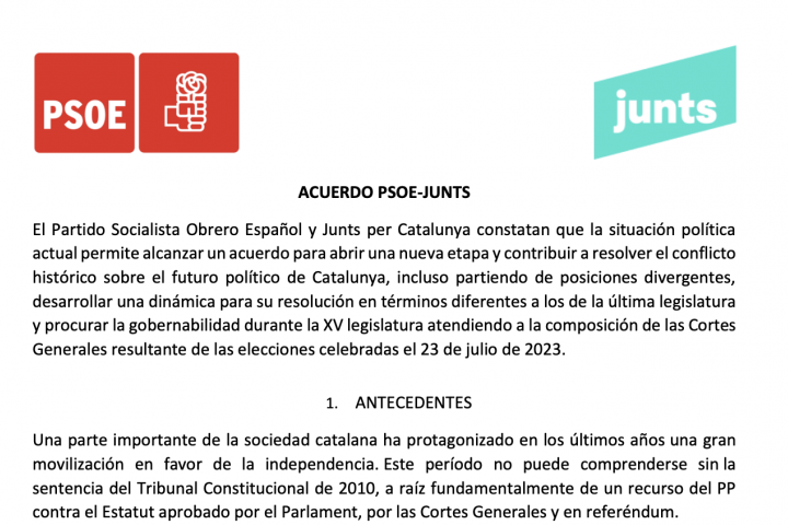 Un acuerdo en el que ambas formaciones han trabajado meses y que se ha dilatado en la última semana por el interés de las dos partes de dejar bien cerrada la ley de amnistía, pata fundamental del pacto, cuyo contenido se dará a conocer en los próximos días.