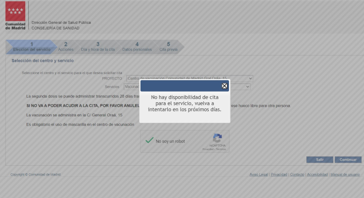 "Si el Gobierno otra vez se quedará de brazos cruzados, no sabemos si en el futuro esto puede volver a estallar", explicaba Ayuso, quien ha garantizado que la Comunidad de Madrid "está encima y poniendo todos los recursos disponibles, multiplicando los efectivos hasta la fecha y siguiendo los protocolos de actuación, junto con la vacunación". Sin embargo, acceder a la web en la que se solicitan las citas en la Comunidad de Madrid es imposible. Si bien es cierto que durante este miércoles y jueves se podían solicitar multitud de citas en la web, incluso disponibles para este viernes, para el centro de vacunación de la calle General Oráa, 15, este viernes es imposible pedir una cita.