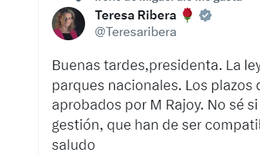 La ministra de Transición Ecológica y Reto Demográfico, Teresa Ribera, ha aguado este lunes en X (antes Twitter) un anuncio que la presidenta extremeña del Partido Popular, María Guardiola, ha quedo compartir con sus seguidores. Y lo ha hecho con la ley en la mano.